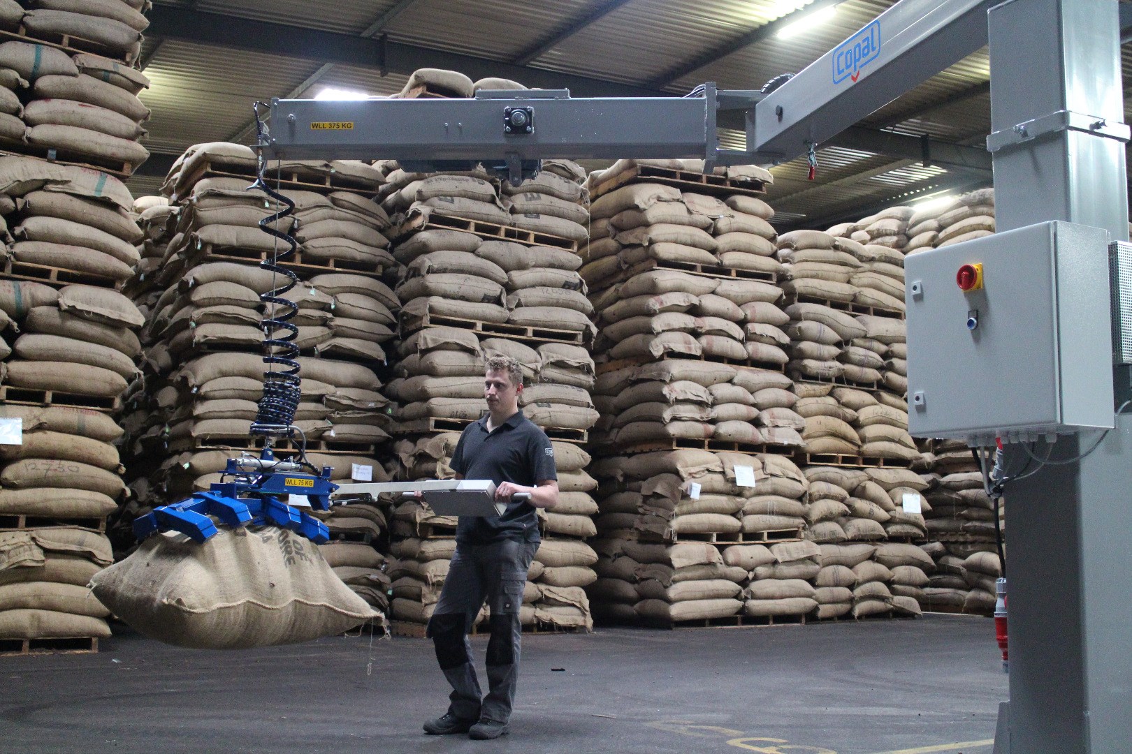 Deze til hulp is uitgevoerd met een knik arm aan een zware kolom en voorzien van instelbare remmen op de assen. Het hefvermogen bedraagt 350 Kg op 3,5 mtr afstand van de kolom. Aan de til hulp hangt een speciaal door ons ontworpen jute zakken grijper.